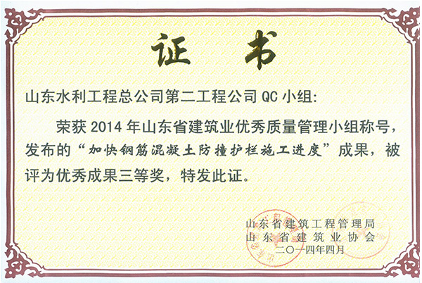 公司“加快鋼筋混凝土防撞護(hù)欄施工進(jìn)度”榮獲2014年山東省建筑業(yè)優(yōu)秀質(zhì)量管理優(yōu)秀成果三等獎(jiǎng)