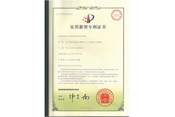 實用新型專利證書—自變風葉角度風力發(fā)電機