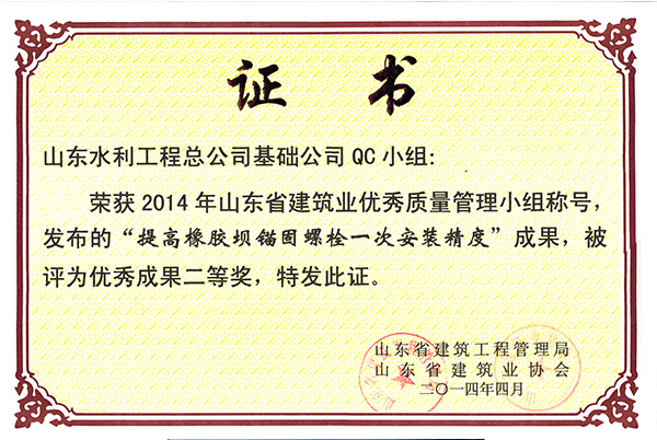 公司“提高橡膠壩錨固螺栓一次安裝精度”榮獲2014年山東省建筑業(yè)優(yōu)秀質(zhì)量管理優(yōu)秀成果二等獎(jiǎng)