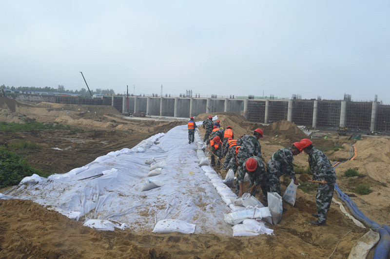 防洪度汛演練模擬的是洪水來襲,值班人員巡視圍堰時(shí)發(fā)現(xiàn)薄弱處有決口的危險(xiǎn),值班人員迅速向報(bào)告,召集搶險(xiǎn)大隊(duì)成員攜帶防汛工具和物資迅速集結(jié),通過填筑沙袋、拋石、打樁等措施消除圍堰隱患,保證了工程安全。