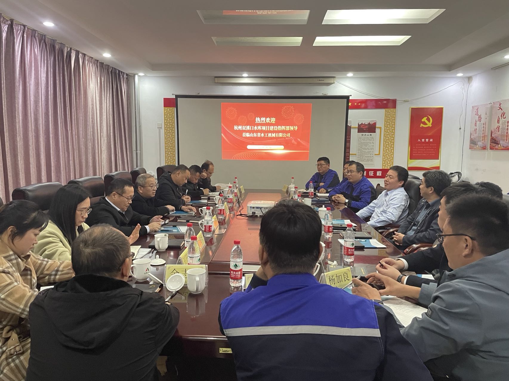 11月13日-14日,杭州市臨安區(qū)雙溪口水庫工程建設(shè)指揮部副總指揮、水利水電局黨委副書記劉保法等一行蒞臨水工機(jī)械公司考察指導(dǎo)工作,山東水總黨委副書記、董事、總經(jīng)理靳文碩,黨委委員、副總經(jīng)理付海華,第六分公司、杭州魯潤公司等相關(guān)人員陪同考察。