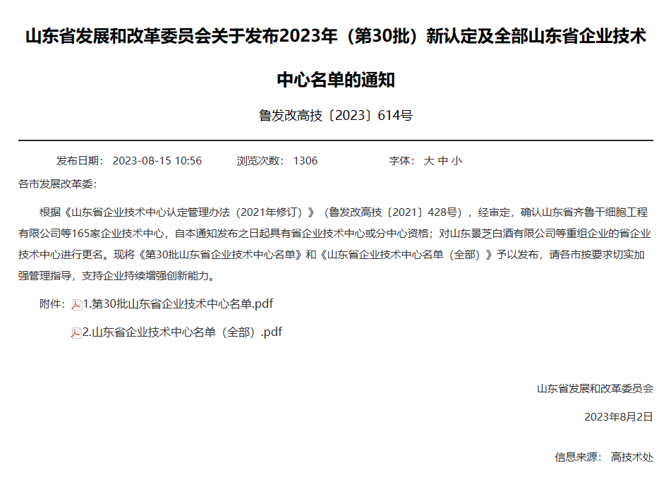 8月15日,山東省發(fā)展和改革委員會發(fā)布2023年山東省企業(yè)技術(shù)中心名單,公司憑借自身綜合創(chuàng)新能力成功入選,獲評山東省企業(yè)技術(shù)中心稱號。