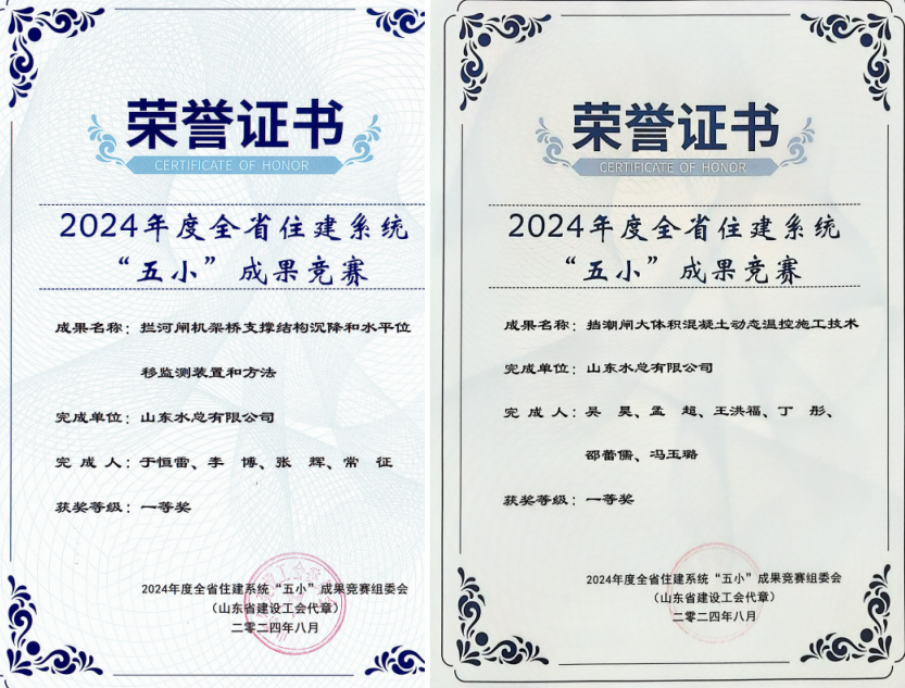 近日,由山東省建設(shè)建材工會和山東省建設(shè)科技與教育協(xié)會組織的2024年度全省住建系統(tǒng)“五小”成果競賽發(fā)布獲獎名單,公司申報的《擋潮閘大體積混凝土動態(tài)溫控施工技術(shù)》、《攔河閘機架橋支撐結(jié)構(gòu)沉降和水平位移檢測裝置和方法》等8項創(chuàng)新成果分別榮獲一等獎2項,二等獎2項,三等獎4項。
