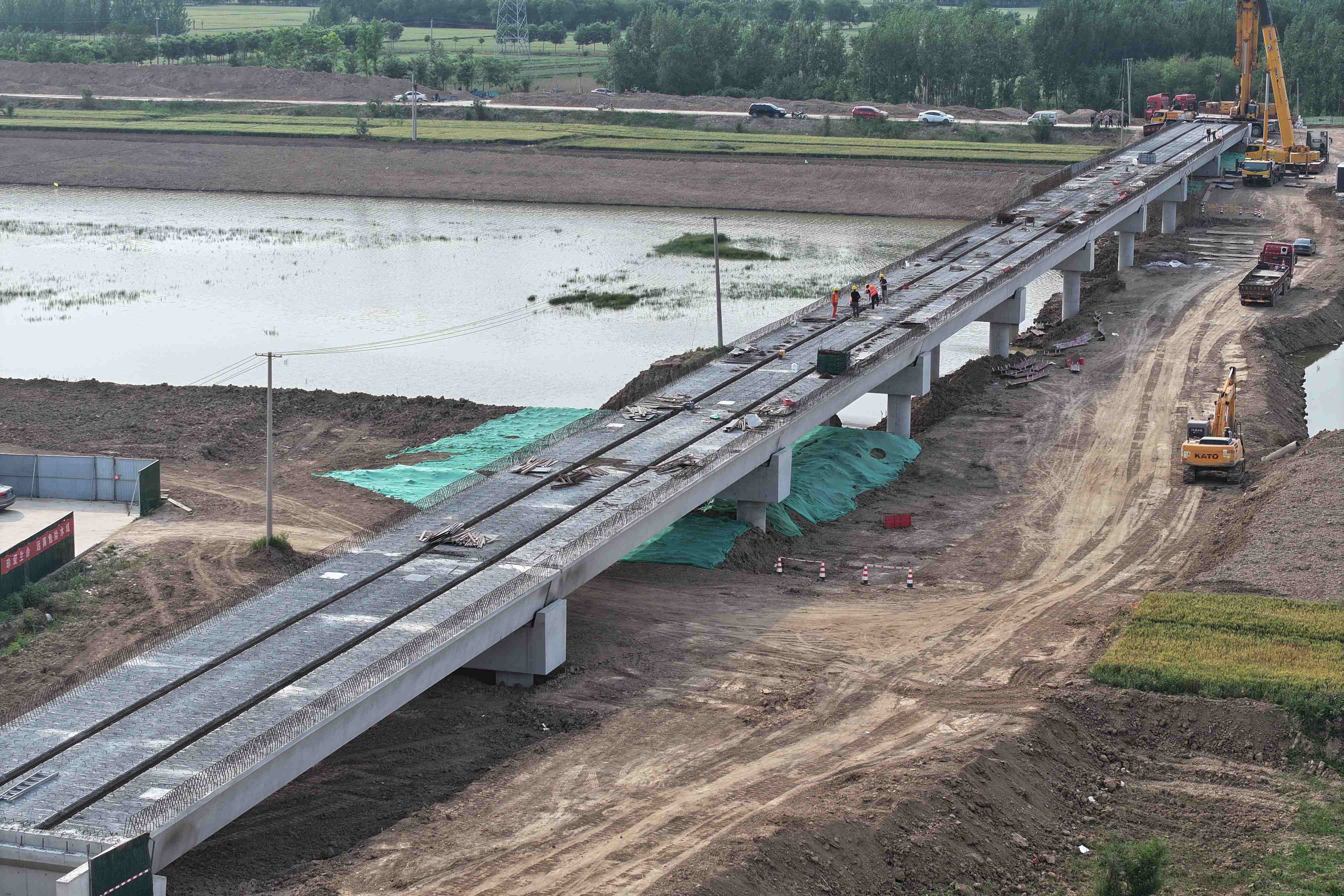 德惠新河綜合治理工程二期工程是德州市重要水利建設(shè)項目,項目建成后將在經(jīng)濟上提升水資源管理效率,確保農(nóng)業(yè)灌溉和汛期泄洪的穩(wěn)定性,優(yōu)化排水系統(tǒng)?;艏覙蚴窃擁椖筷P(guān)鍵組成部分,該橋全長270米,共3聯(lián),預(yù)制箱梁總計27片。