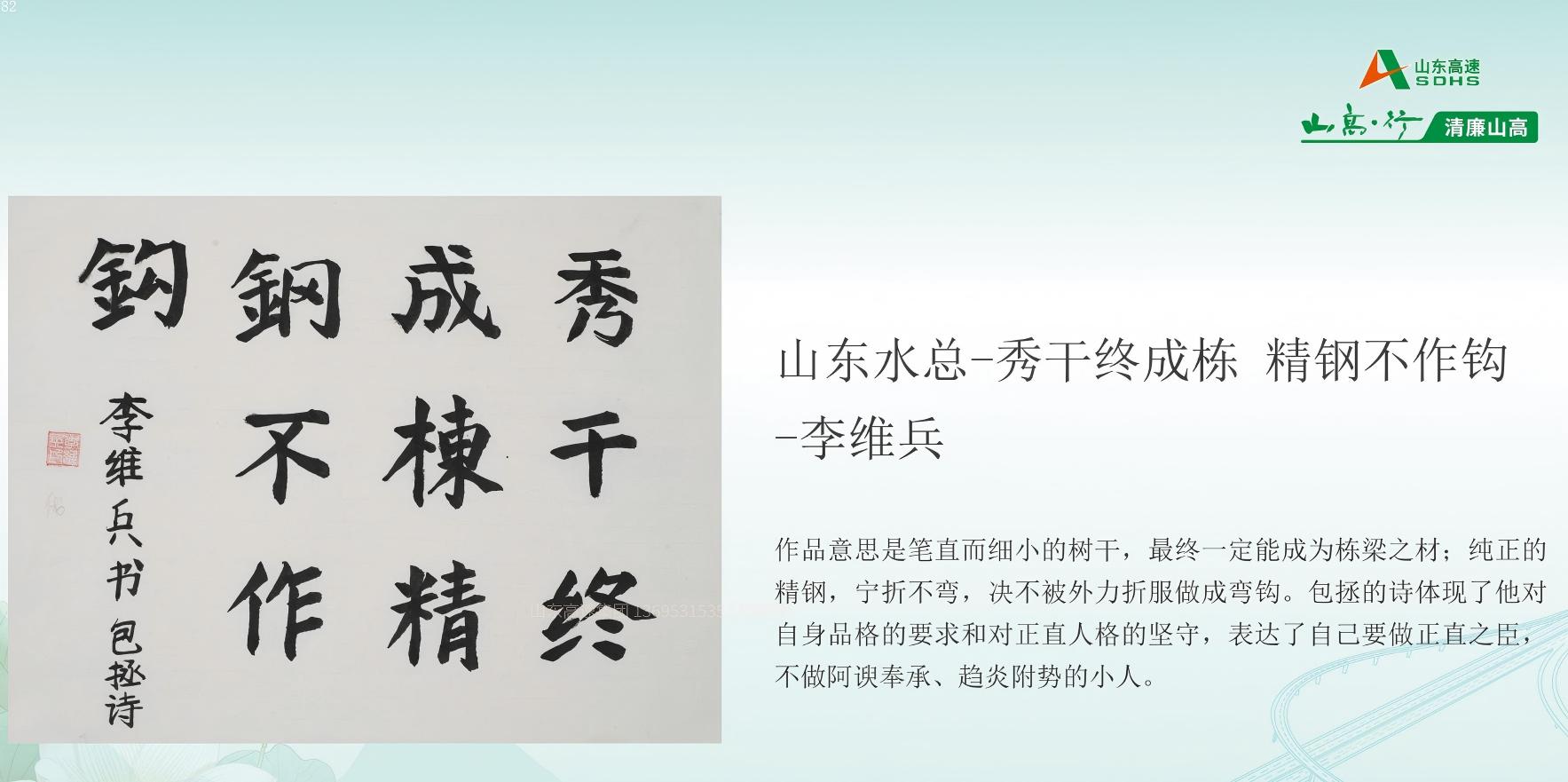 6月11日,在山東高速集團紀委組織的“清廉山高”廉潔文化作品征集活動中,山東水總基礎(chǔ)工程有限公司制作的短視頻《筑廉潔防線,守初心之路》榮獲“光影映廉”板塊三等獎,第二分公司李維兵的書法作品《秀干終成棟,精鋼不作鉤》摘得“工藝創(chuàng)廉”書法類優(yōu)秀獎。