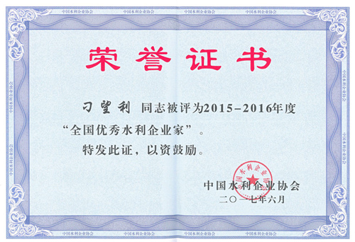 公司刁望利同志榮獲2015-2016年度“全國(guó)優(yōu)秀水利企業(yè)家”